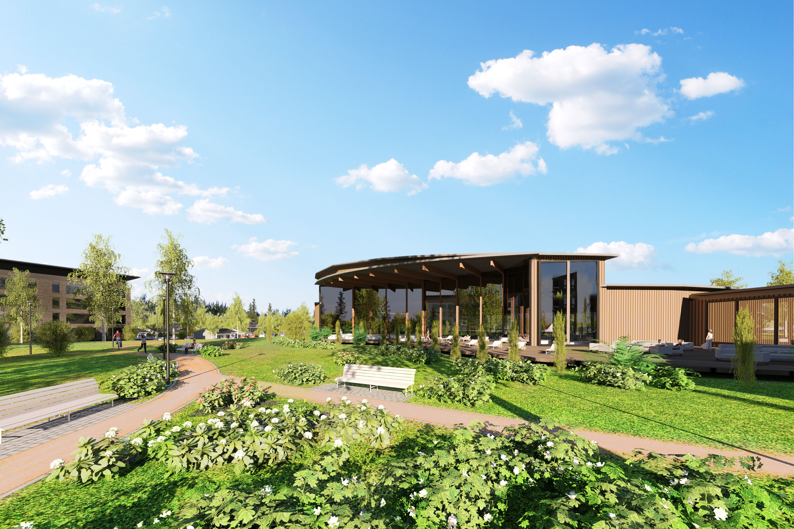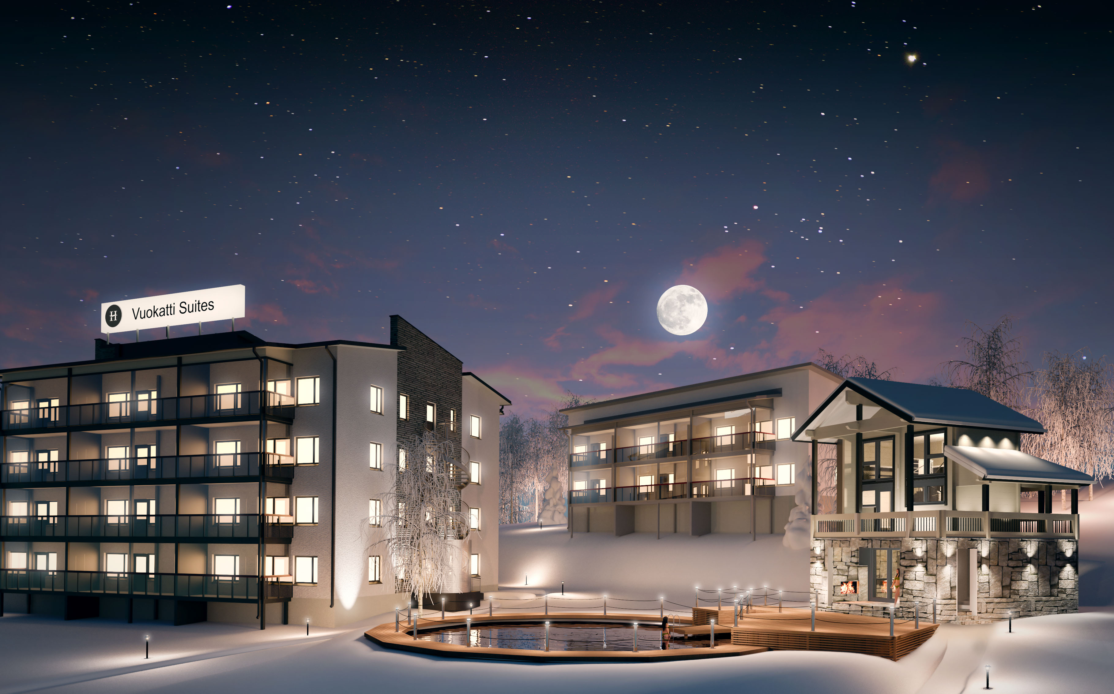 Vuokatti Suites, Ympyrämedia Oy, Hotellin ja saunarakennuksen visualisointi, 2014.